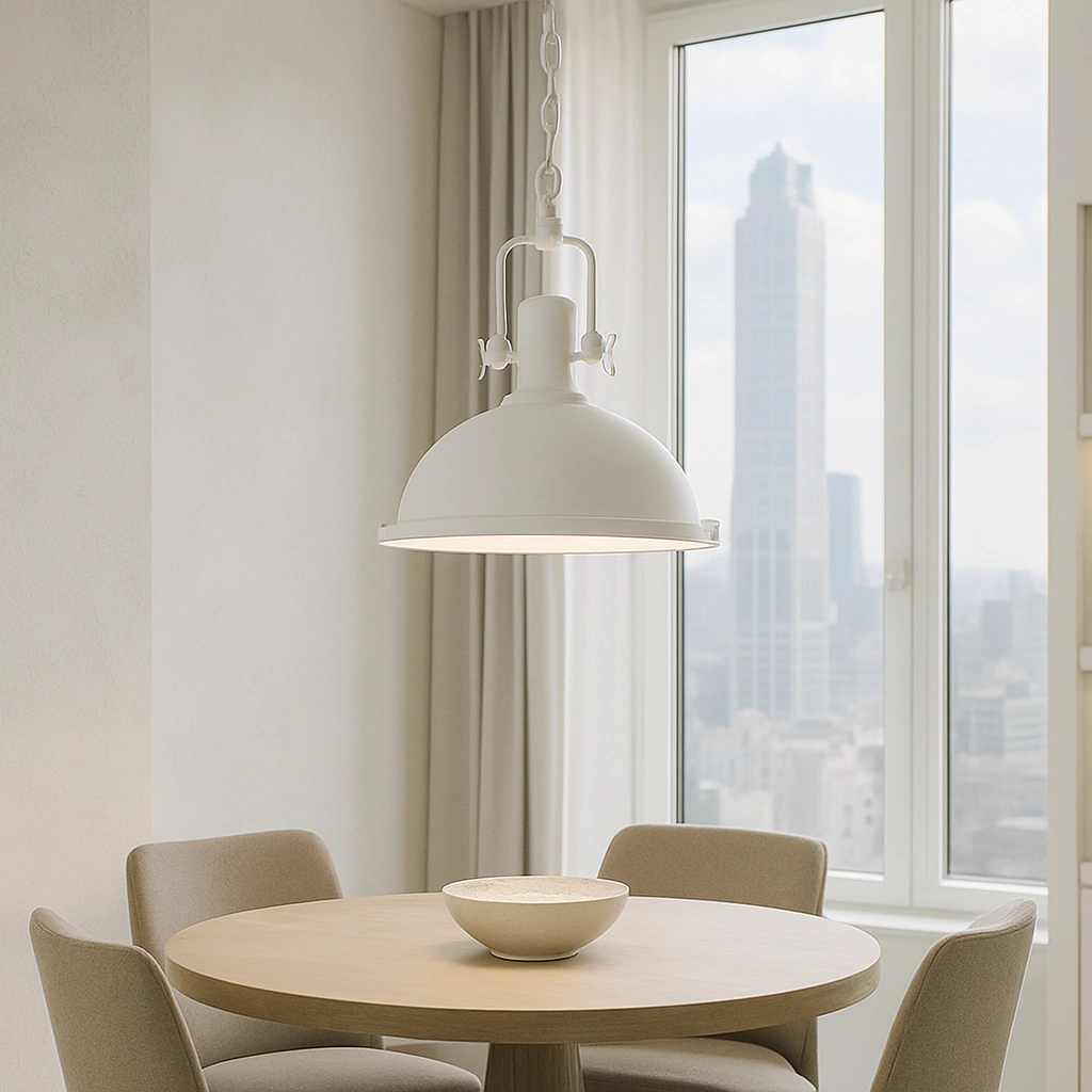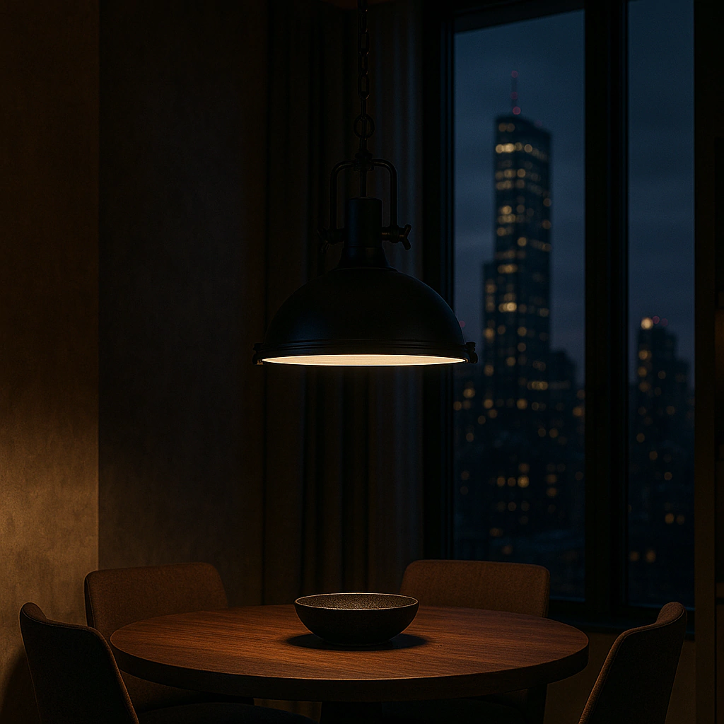 Con un diseño industrial de hierro es perfecto para colocar sobre una mesa de comedor. Su estructura metálica y acabado negro mate le otorgan un estilo robusto y sofisticado, ideal para espacios modernos o de inspiración vintage. Su diseño colgante aporta carácter y personalidad a cualquier ambiente.